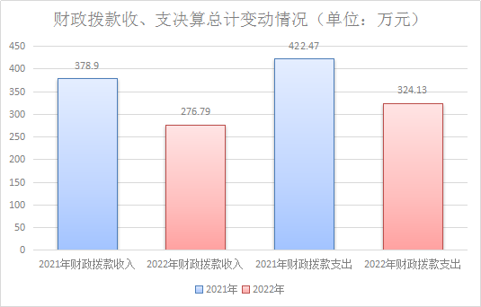 2022年财政拨款收入总计276.79万元、支出总计324.13万元。与2021年相比,财政拨款收入减少102.11万元、支出总计减少98.34万元,各下降26.95%、23.28%。主要变动原因是辖区人口减少,导致项目资金收入减少;支出主要变动原因是本年财政拨款收入减少,因此支出减少。