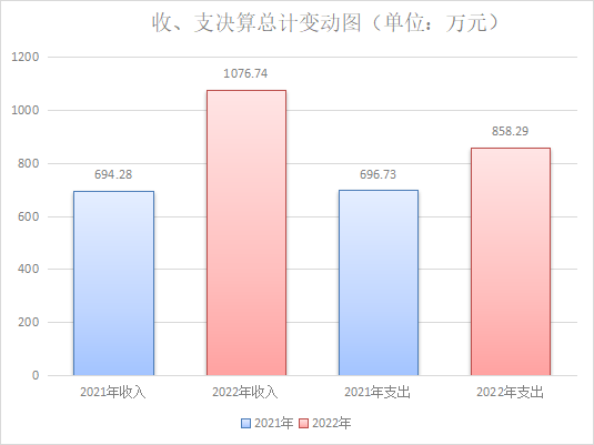 2022年度收入总计1076.74万元、支出总计858.29万元。与2021年相比,收入总计增加382.46万元、支出总计各增加161.56万元,分别增长55.09%、23.19%。主要变动原因是本年新增项目较多,财政收入增加,卫生院新增PCR实验室、医疗实验室能力提升,促使卫生院业务收入增加;本年人员增加及人员工资调标及项目支出均导致卫生院支出增加。