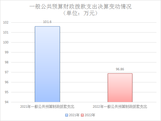 2022年一般公共预算财政拨款支出96.86万元,占本年支出合计的48.81%。与2021年相比,一般公共预算财政拨款支出减少4.74万元,减少4.67%。主要变动原因是公用经费减少。