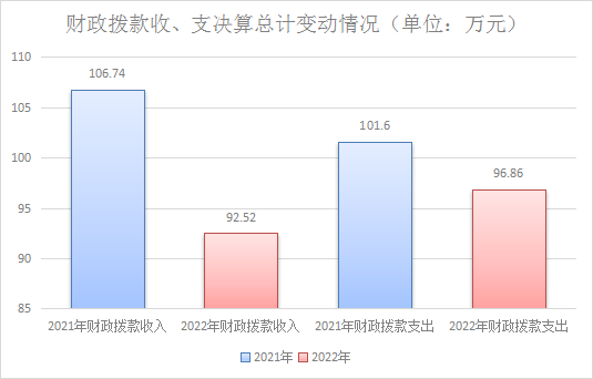 2022年财政拨款收入总计92.52万元、支出总计96.86万元。与2021年相比,财政拨款收入减少14.22万元、支出减少9.88万元,各减少13.32%、9.72%。收入主要变动原因是项目收入减少,支出减少主要原因是公用经费减少。
