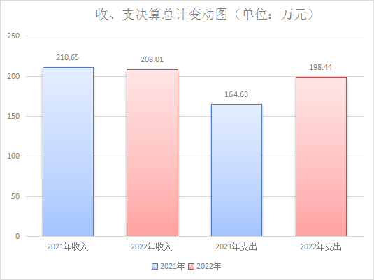 2022年度收入总计208.01万元、支出总计198.44万元。与2021年相比,收入总计减少2.64万元、支出增加33.81万元,收入减少1.26%、支出增加20.54%。收入主要变动原因是本年业务收入减少;支出主要变动原因是人员经费和公用经费增加,支出相应增加。