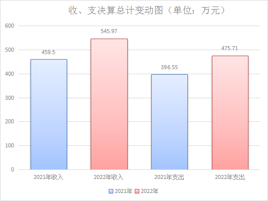 2022年度收入总计545.97万元、支出总计475.71万元。与2021年相比,收入总计增加86.47万元、支出总计各增加79.16万元,分别增长18.82%、19.96%。收入主要变动原因是机构合并医疗服务能力提升,本年业务收入增加,财政拨款增加,故本年度收入增加;支出主要变动原因是机构合并人员经费和公用经费增加,支出相应增加。