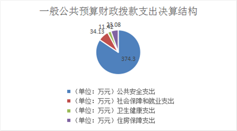 2022年一般公共预算财政拨款支出442.93万元,主要用于以下方面:公共安全支出374.30万元,占84.50%;社会保障和就业支出34.13万元,占7.71%;卫生健康支出11.42万元,占2.58%;住房保障支出23.08万元,占5.21%。