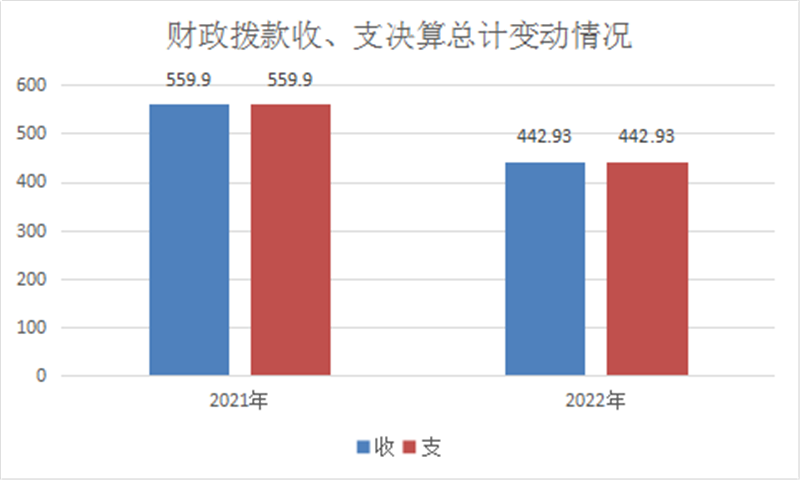2022年财政拨款收、支总计442.93万元。与2021年相比,财政拨款收、支总计各减少116.97万元,下降20.89%。主要变动原因是人员调出人员经费减少,日常公用开支减少。