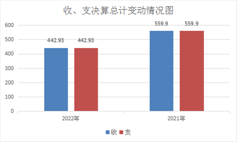 2022年度收入总计442.93万元,支出总计442.93万元。与2021年相比,收、支总计各减少116.97万元,下降20.89%。主要变动原因是人员调出人员经费减少,日常公用开支减少。