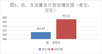 2022年度收、支总计472.11万元。与2021年相比,收、支总计各增加59.24万元,增长14.35%。主要变动原因是人员新增和经费标准提高。