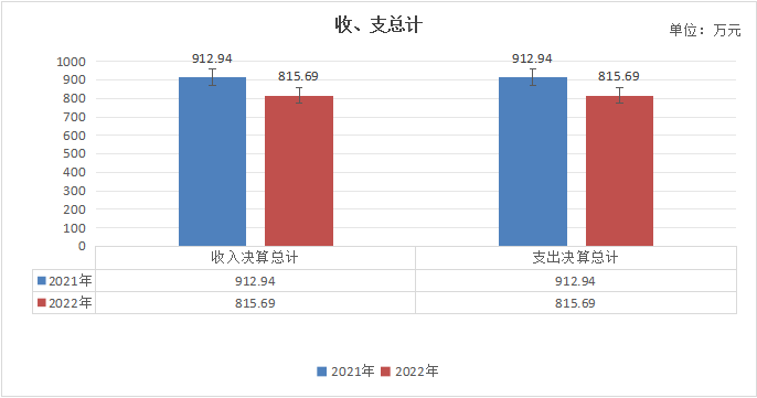 2022年度收、支总计815.69万元。与2021年相比,收、支各总计减少97.25万元,下降10.65%。主要变动原因是按照有关要求,树立过“紧日子”和坚持厉行节约、反对浪费意识,强化内部管理,进一步压减费用支出。
