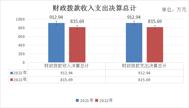 2022年财政拨款收、支总计815.69万元。与2021年相比,财政拨款收、支总计各减少97.25万元,下降10.65%。主要变动原因是按照有关要求,树立过“紧日子”和坚持厉行节约反对浪费意识,强化内部管理,进一步压减费用支出。