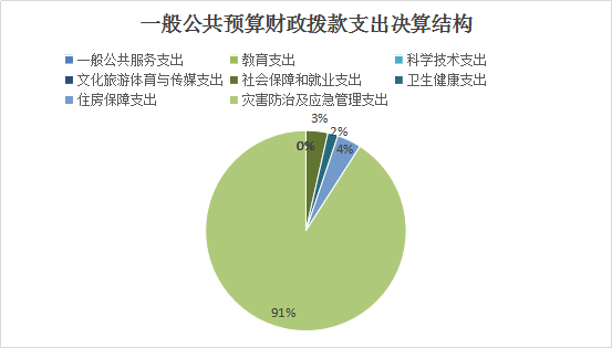 2022年一般公共预算财政拨款支出1300.70万元,主要用于以下方面:一般公共服务支出0万元,占0%;教育支出0万元,占0%;科学技术支出0万元,占0%;文化旅游体育与传媒支出0万元,占0%;社会保障和就业支出45.94万元,占3.53%;卫生健康支出21.33万元,占1.64%;住房保障支出50.75万元,占3.90%;灾害防治及应急管理支出1182.68万元,占90.93%。