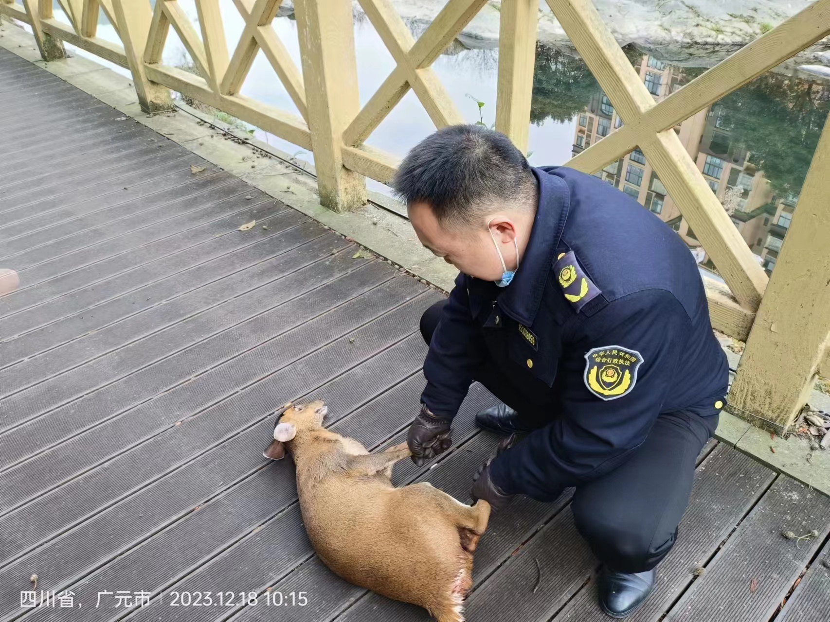 12月18日上午,青川县综合行政执法局执法人员在县城区唐家扁处巡查时,发现一只从山坡上滚落下来的受伤动物,执法人员立即走近查看,发现该动物身体较为虚弱且腿部带有伤,随后他们便立即联系森林公安将受伤的动物送至救助站进行专业救治,经鉴定,该动物属于国家二级保护动物—黄麂子。