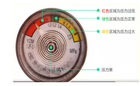 四是看压力。灭火器把手下有一压力指示器,若指针在红色区域,说明灭火器压力不足,不能购买和使用。