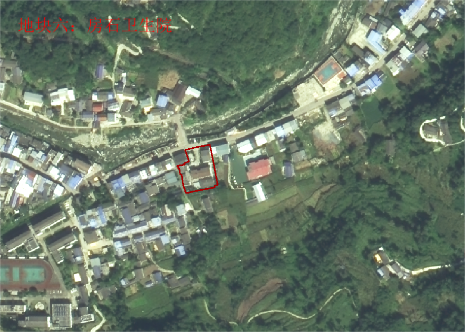(房石卫生院)地块六位于房石镇大石坝社区,四周东至郑光明,郑光辉,吕正文房屋,西至道路,南至堡坎,北至道路,面积为2370.62㎡,经实地踏勘调查并经大石坝社区核实,该地于1985年修建房石卫生院,地震后原址重建,范围内的土地已经全部征收完毕,为存量国有土地,与集体土地权属无争议。