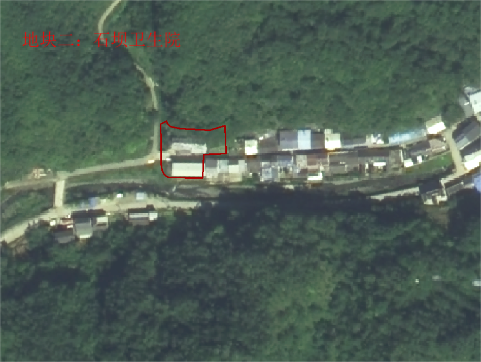 (石坝卫生院)地块二位于石坝乡大房村,四周东至王有学和文国平房屋,南至河流,西至河流,北至山,面积为1628.02㎡,经实地踏勘调查并经大房村核实,该宗地于地震后原址重建石坝卫生院,原卫生院修建于50年代,为国有土地,与村集体无权属争议。