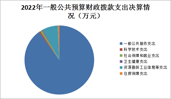 2022年一般公共预算财政拨款支出3396.17万元,主要用于以下方面:一般公共服务201(类)支出3060.13万元,占90.08%;科学技术206(类)支出20.46万元,占0.60%;社会保障和就业208(类)支出31.26万元,占0.92%;卫生健康支出210(类)13.16万元,占0.39%;资源勘探工业信息等支出215(类)246.06万元,占7.24%;住房保障支出221(类)25.10万元,占0.74%。
