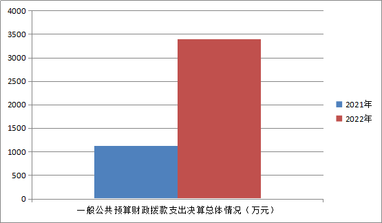 2022年一般公共预算财政拨款支出3396.17万元,占本年支出合计的43.46%。与2021年相比,一般公共预算财政拨款支出增加2275.83万元,增长203.14%。主要变动原因是:一是2022年一般公共服务支出3060.13万元,2021年支出972.86万元;二是2022年科学技术支出20.46万元,2021年支出30.00万元;三是2022年社会保障和就业支出31.26万元,2021年支出37.47万元;四是2022年卫生健康支出13.16万元,2021年支出15.23万元;五是2022年资源勘探信息等支出246.06万元,2021年支出35.45万元;六是2022年住房保障支出25.10万元,2021年支出29.33万元。