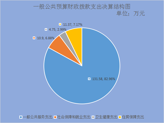 2022年一般公共预算财政拨款支出158.60万元,主要用于以下方面:一般公共服务支出131.58万元,占82.96%;社会保障和就业支出10.90万元,占6.88%;卫生健康支出4.75万元,占2.99%;住房保障支出11.37万元,占7.17%。