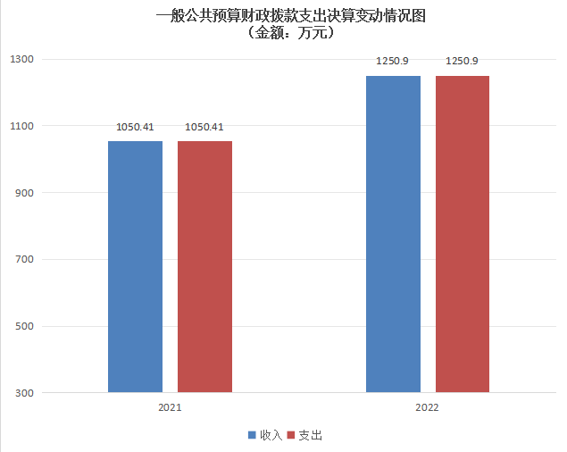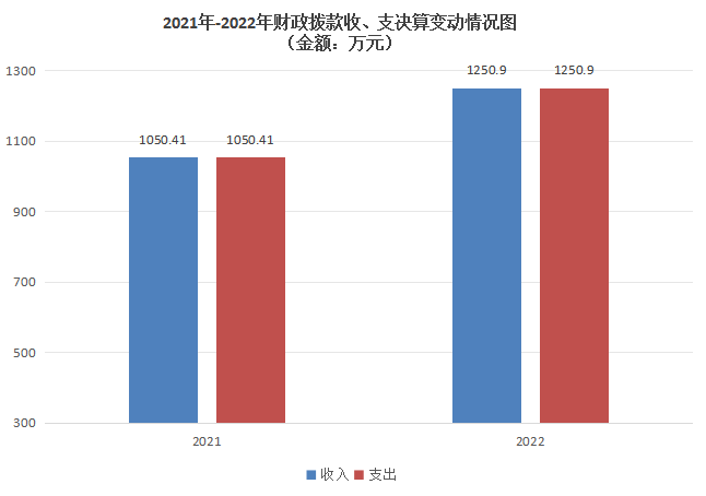 2022年度收、支总计1250.9万元。与2021年相比收、支总计各增加200.49万元,增长19%。主要变动原因是2022年在职人员调资,专项工作经费、基本支出中的人员经费支出有所增加。