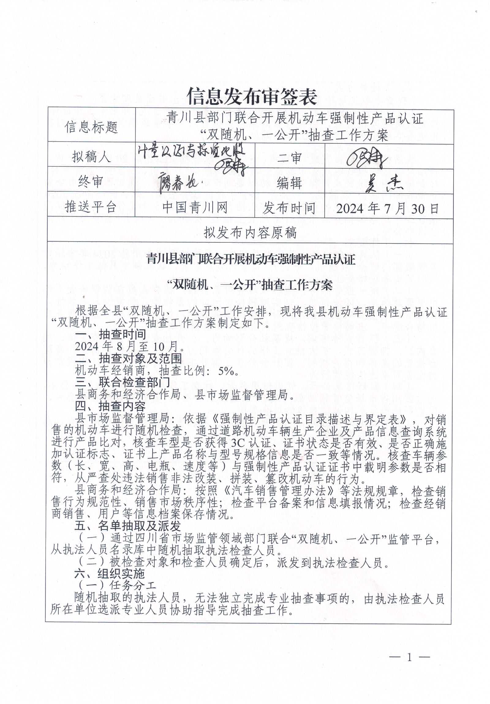 根据全县“双随机、一公开”工作安排,现将我县机动车强制性产品认证“双随机、一公开”抽查工作方案制定如下。