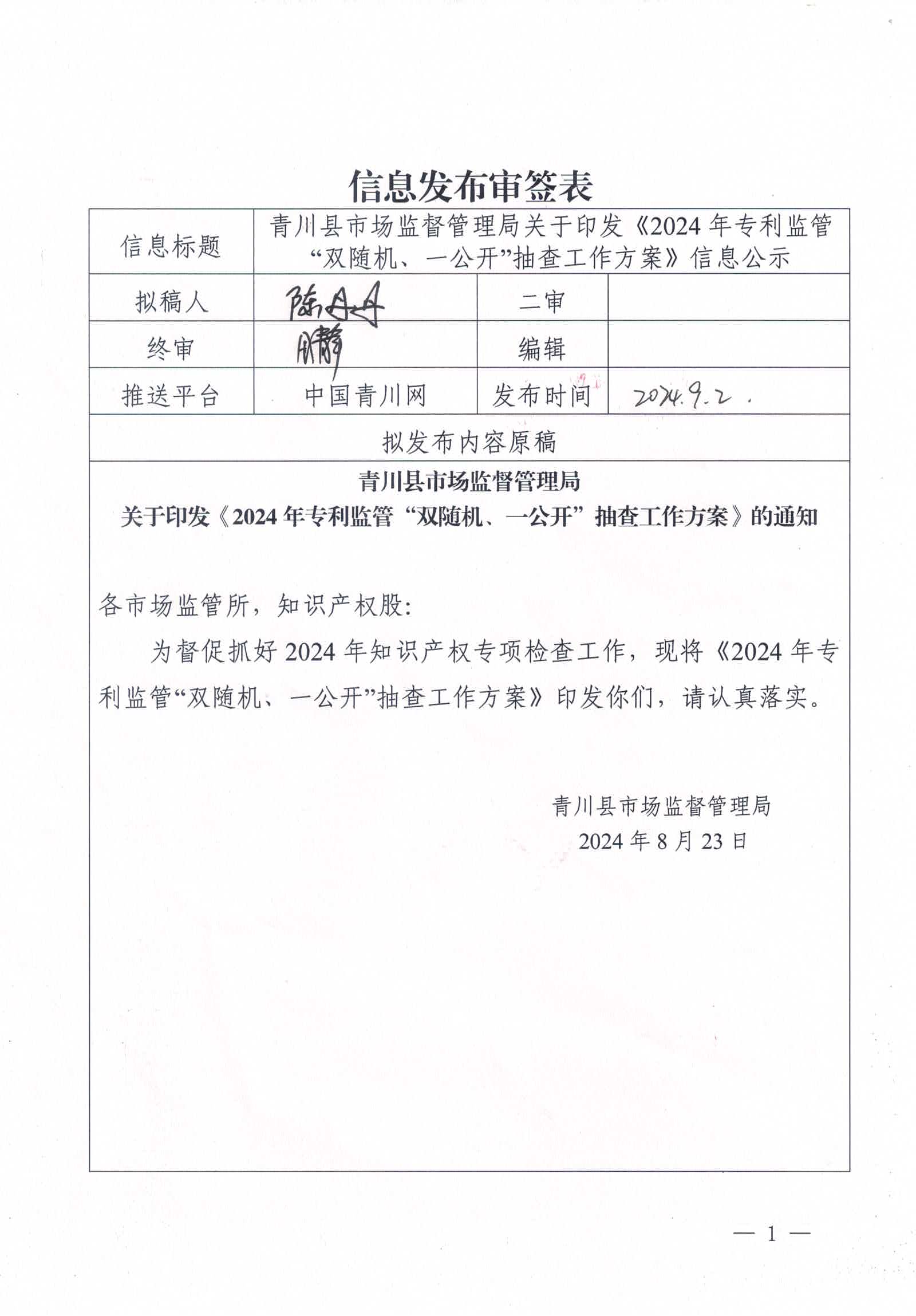 青川县区域内各类市场主体和产品,有效发明专利的使用情况,专利真实性监督检查抽取比例为20%。