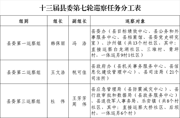 县委决定,本轮巡察共派出3个巡察组,对县委办等8个部门乡镇党组织开展常规巡察,对下辖21个村(社区)开展一体巡察,同步开展选人用人及基层党建工作和意识形态工作专项检查。