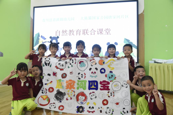 在联合课堂上,唐家河自然教育中心的老师们通过动物视频介绍了唐家河常见的野生动植物,小朋友们用画笔画下了“唐家河四宝”,同时小朋友们还体验了竹编课程,课堂的最后唐家河为青溪幼儿园赠送了科普读物。