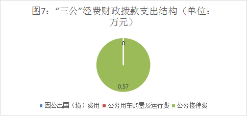 2023年度“三公”经费财政拨款支出决算中,因公出国(境)费支出决算0万元,占0%;公务用车购置及运行维护费支出决算0万元,占0%;公务接待费支出决算0.57万元,占100%。具体情况如下: