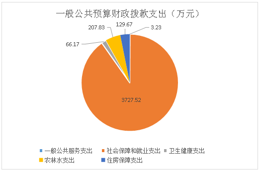 2023年度一般公共预算财政拨款支出4134.42万元,主要用于以下方面:一般公共服务支出3.23万元,占0.1%;社会保障和就业支出3727.52万元,占90.2%;卫生健康支出66.17万元,占1.6%;农林水支出207.83万元,占5%;住房保障支出129.67万元,占3.1%。