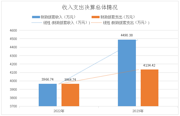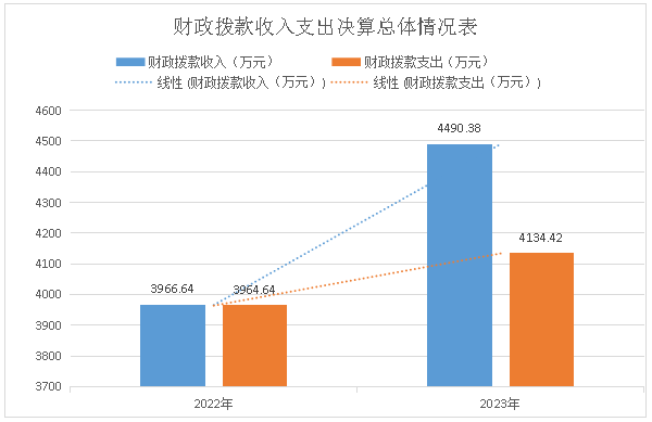 2023年度财政拨款收、支总计均为4490.38万元。与2022年度相比,财政拨款收入增加523.64万元,增长13.2%;支出总计增加169.68万元,增长4.3%。主要变动原因是2023年青川县公共实训基地建设项目财政拨款收入、支出新增1086.32万元。