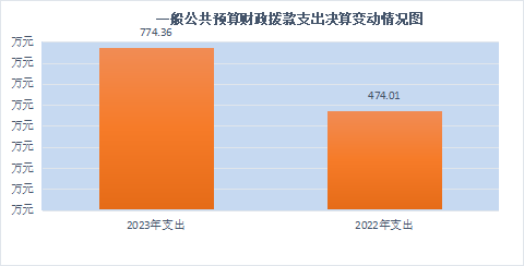 2023年度一般公共预算财政拨款支出774.36万元,占本年支出合计的100%。与2022年度相比,一般公共预算财政拨款支出增加300.35万元,增长63.36%。主要变动原因是项目支出增加、人员增加、保险基数上调。