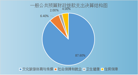 2023年度一般公共预算财政拨款支出774.36万元,主要用于以下方面:文化旅游体育与传媒支出678.49万元,占87.6%;社会保障和就业支出50.21万元,占6.4%;卫生健康支出14.78万元,占2%;住房保障支出30.88万元,占4%。