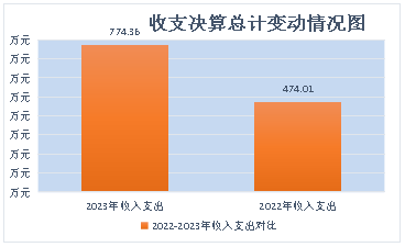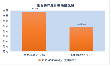 2023年度收、支总计均为774.36万元。与2022年度相比,收、支总计各增加300.35万元,增长63.36%。主要变动原因是项目支出增加、人员增加、保险基数上调。