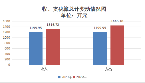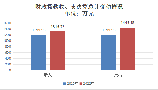 2023年度财政拨款收、支总计均为1199.95万元。与2022年度相比,财政拨款收、支总计各减少116.77万元,245.23万元。下降8.8%,16.9%。主要变动原因一是人员变化,二是本年度项目支出减少。