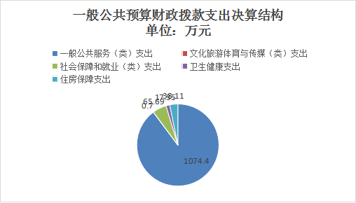 2023年度一般公共预算财政拨款支出1196.45万元,主要用于以下方面:一般公共服务支出1074.4万元,占89.8%;文化旅游体育与传媒支出0.7万元,占0.05%;社会保障和就业支出65.69万元,占5.5%;卫生健康支出17.55万元,占1.5%;住房保障支出38.11万元,占3.15%。