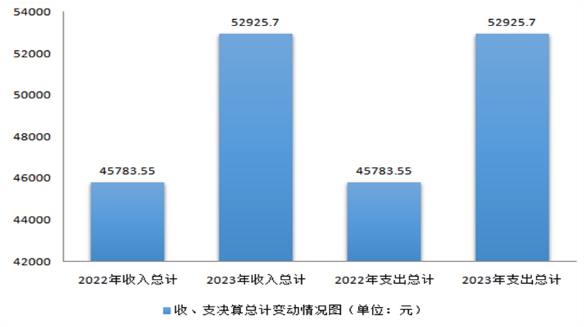 2023年度收、支总计均为52925.70万元。与2022年度相比,收、支总计各增加7142.15万元,增长15.60%。主要变动原因为:一是本级财政对教育投入的增加,如青川县乔庄初级中学校迁建项目、保安服务费等项目;二是专项资金投入增加,如教育强国项目教去年增加、义教公用经费提标等;三是按照2022年9月1日起施行的《中小学校财务制度》(财教〔2022〕159号)文件规定,课后延时服务费计入其他收入。