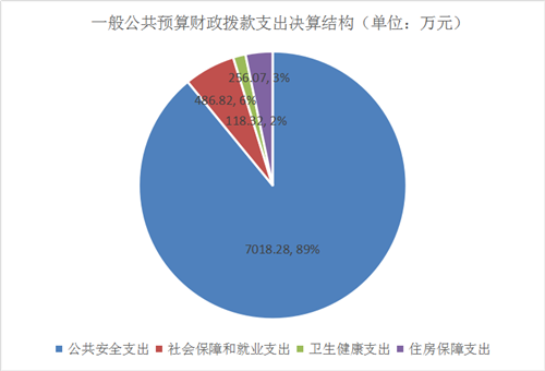 2023年度一般公共预算财政拨款支出7879.48万元,主要用于以下方面:公共安全支出7018.28万元,占89%;社会保障和就业支出486.82万元,占6%;卫生健康支出118.32万元,占2%;住房保障支出256.07万元,占3%。