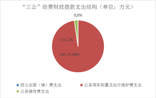 2023年度“三公”经费财政拨款支出决算中,因公出国(境)费支出决算0万元,年初未安排预算;公务用车购置及运行维护费支出决算145.76万元,占98%;公务接待费支出决算3.31万元,占2%。具体情况如下: