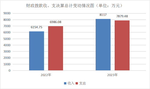 2023年度财政拨款收入总计8117.00万元、支出总计7879.48万元。与2022年度相比,收入增加1962.25万元、增长32%,支出总计增加893.40万元,增长13%。主要变动原因是人员经费增加、中央和省级政法转移支付资金及专案经费收入、支出增加。