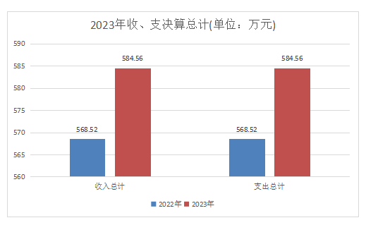 2023年度收、支总计均为584.56万元。与2022年度相比,收、支总计各增加16.04万元,增长2.82%。主要变动原因是人员经费收入支出增加。