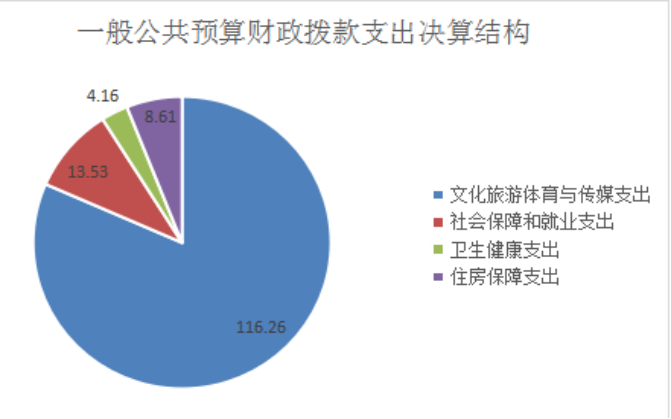 2023年一般公共预算财政拨款支出142.56万元,主要用于以下方面:一般公共服务支出0万元,占0%;教育支出0万元,占0%;科学技术支出0万元,占0%;文化旅游体育与传媒支出116.26万元,占比81.87%;社会保障和就业支出13.53万元,占9.49%;卫生健康支出4.16万元,占2.92%;住房保障支出8.61万元,占5.72%。