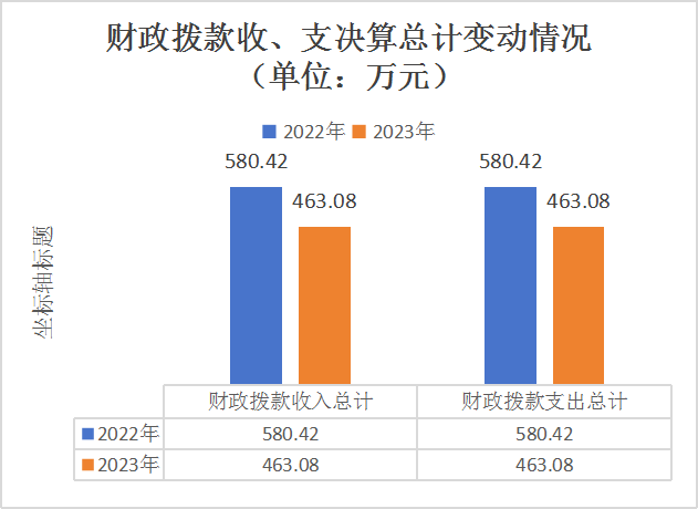 2023年度财政拨款收、支总计均为463.08万元。与2022年度相比,财政拨款收入总计减少117.34万元,支出总计减少117.34万元,收入下降20.2%,支出减少20.2%。主要变动原因:本年度项目资金收入支出减少。
