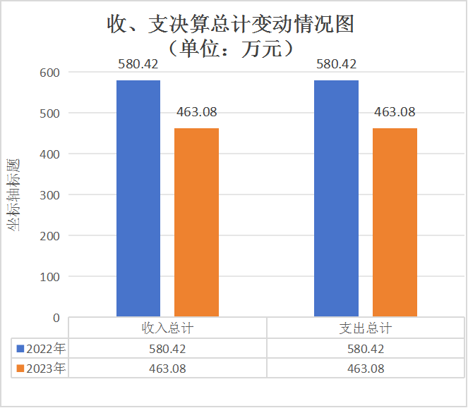 2023年度收入总计463.08万元,支出总计463.08万元。与2022年度相比,收入总计减少117.34万元,支出总计减少117.34万元,收入下降20.22%,支出减少20.22%。主要变动原因:本年度项目资金收入支出减少。