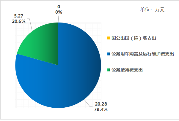 2023年度“三公”经费财政拨款支出决算中,因公出国(境)费支出决算0万元,占0%;公务用车购置及运行维护费支出决算20.28万元,占比79.4%;公务接待费支出决算5.27万元,占20.6%。具体情况如下: