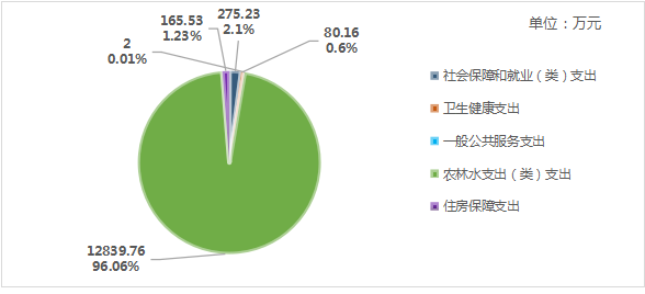 2023年度一般公共预算财政拨款支出13362.68万元,主要用于以下方面:一般公共服务支出2万元,占0.01%;社会保障和就业支出275.23万元,占2.1%;卫生健康支出80.16万元,占0.6%;住房保障支出165.53万元,占比1.23%;农林水支出12839.76万元,占96.06%。