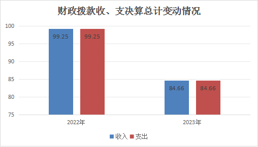 2023年度收入84.66万元、支出84.66万元。与2022年收入99.25万元、支出99.25万元相比,收增加减少14.59万元、支出减少14.59万元。主要变动原因是项目资金减少。