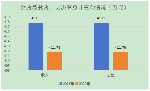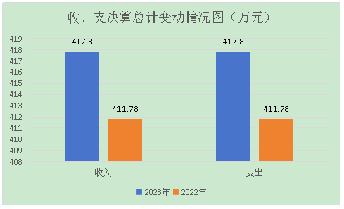 2023年度收、支总计均为417.8万元。与2022年度相比,收、支总计各增加6.02万元,增长1.46%。主要变动原因是有两名人员新进。