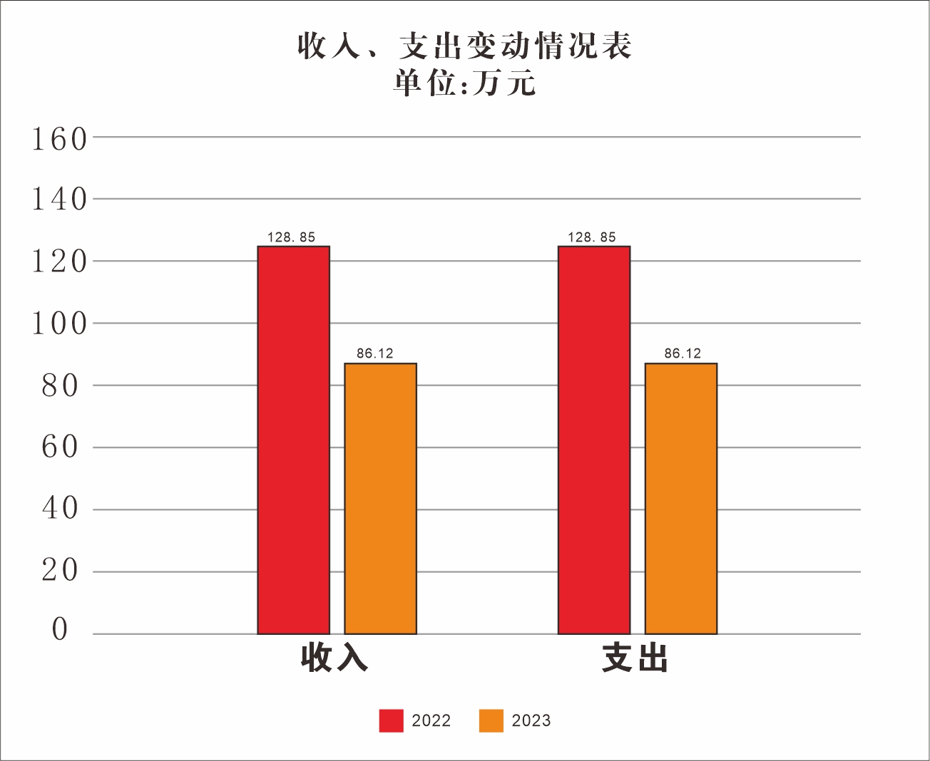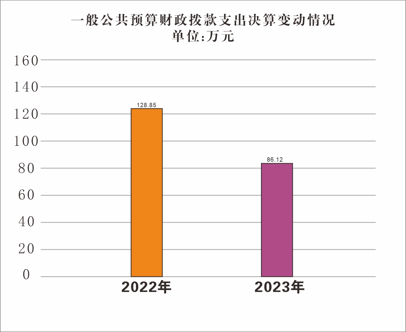 2023年度财政拨款收入总计86.12万元,支出总计86.12万元。与2022年度相比,财政拨款收入总计减少42.73万元,下降33%;支出总计减少42.73万元,下降33%。主要变动原因:2023年度县财政未预算困难群众救助资金。