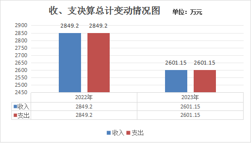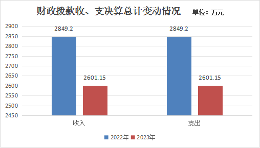 2023年度财政拨款收、支总计均为2601.15万元。与2022年度相比,财政拨款收、支总计各减少248.05万元,下降8.7%。主要变动原因是项目资金减少。