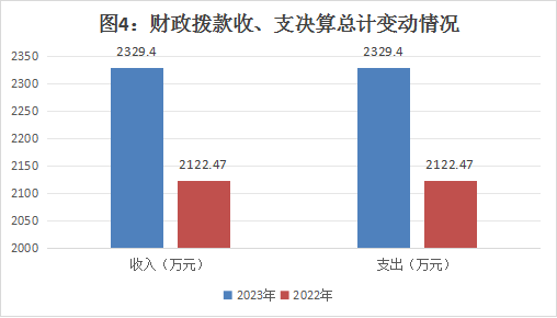 2023年度财政拨款收、支总计均为2329.4万元。与2022年度相比,财政拨款收、支总计各增加206.93万元,增长9.75%。主要变动原因是增加新进人员、增加项目经费支出。