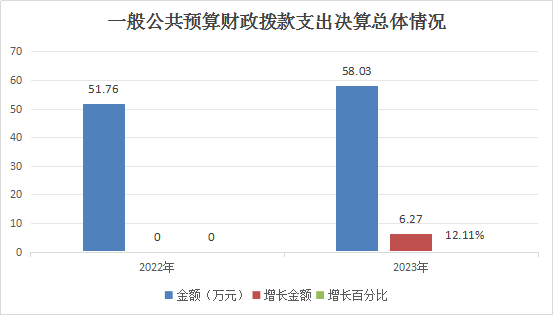 2023年度一般公共预算财政拨款支出58.03万元,占本年支出合计的100%。与2022年度相比,一般公共预算财政拨款支出增加6.27万元,增长12.11%。主要变动原因是人员正常调资增加,退休人员经费增加、正常调资增加养老保险等职工基础绩效奖计入保险基数缴纳,单位部分支出增加。