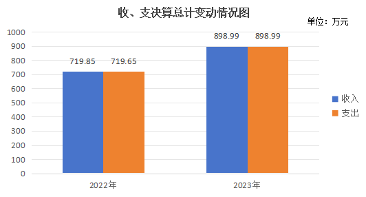 2023年度收、支总计均为898.99万元。与2022年度相比,收入总计增加179.14万元、支出总计增加179.34万元,分别上升24.89%、24.92%。主要变动原因是项目工作开展内容增多,省级补助项目经费增加。